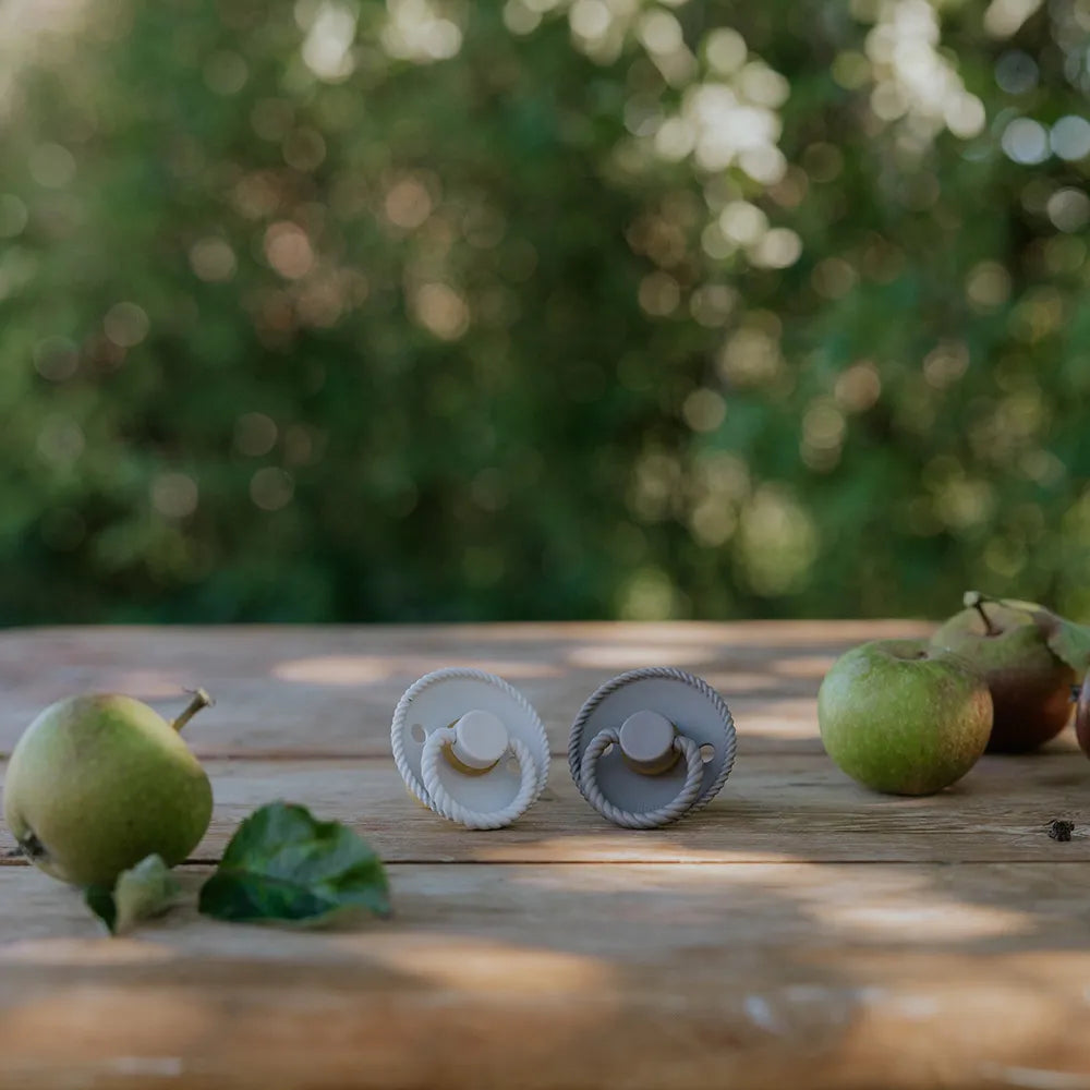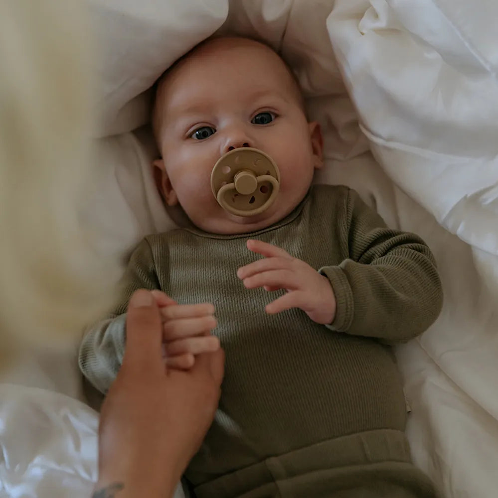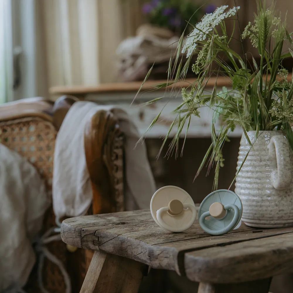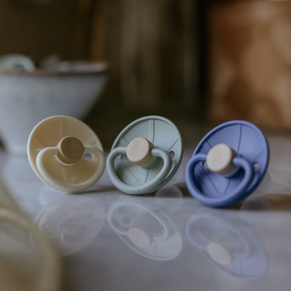 FRIGG Pacifiers has been developed with a focus on function and comfort in everyday life. The round teat shape mimics the shape of the breast and supports a natural sucking technique that many children find comfortable.