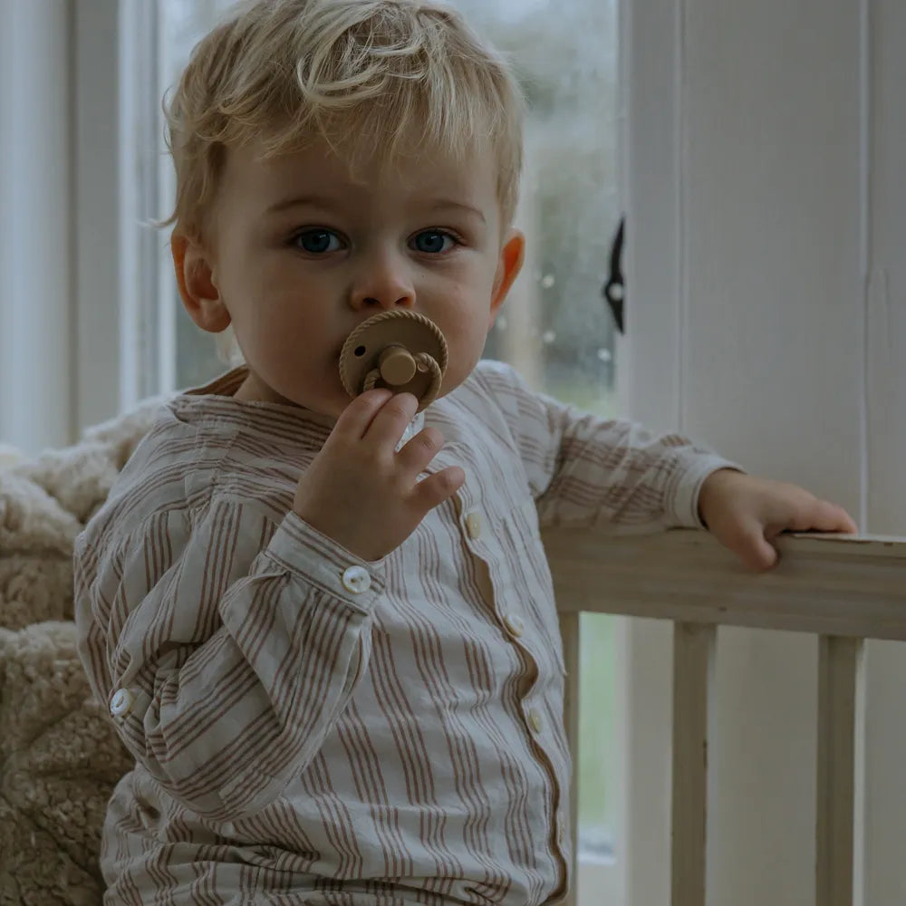 FRIGG pacifiers are created with great care for both child and parent. The shield is made of virgin PP plastic – a clean and strong type of plastic that has never been recycled. This means that we avoid unwanted substances and ensure a uniform, durable and skin-friendly material. Production takes place in Denmark by experienced specialists, where the entire process takes place in-house for maximum control and quality.
