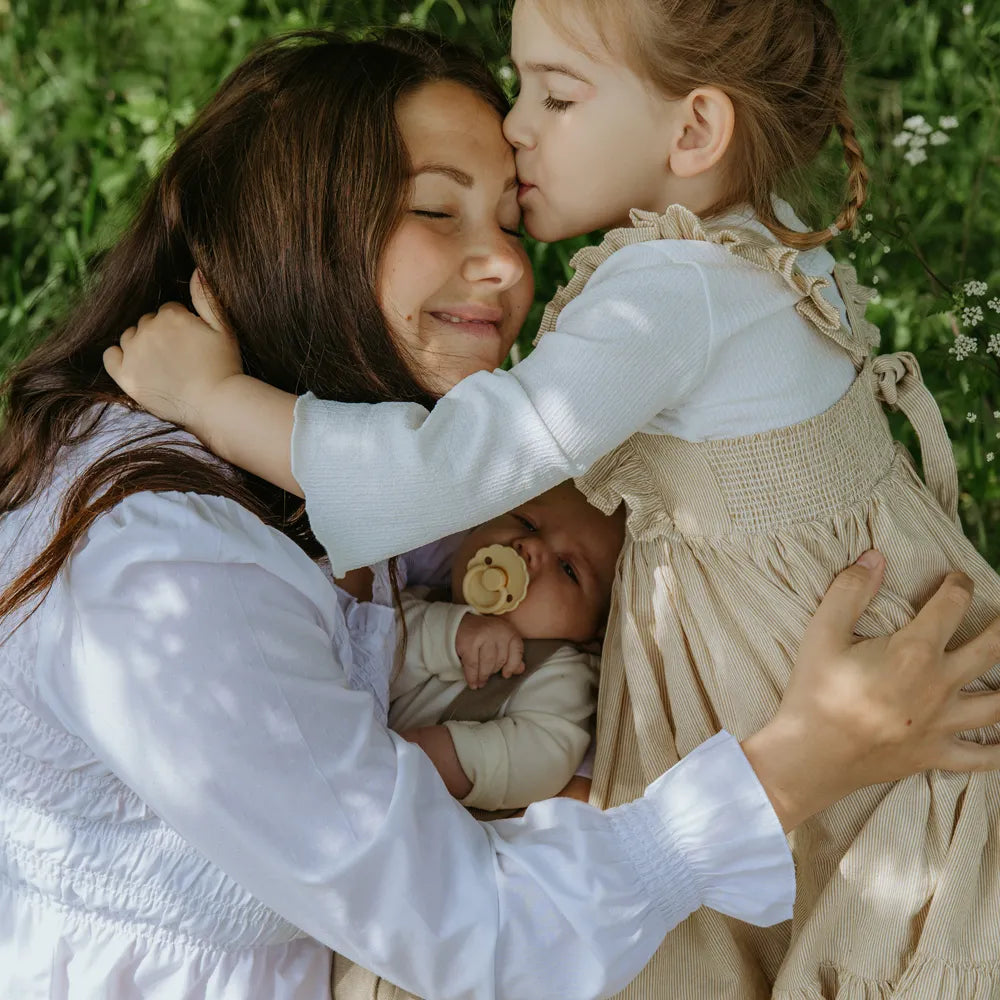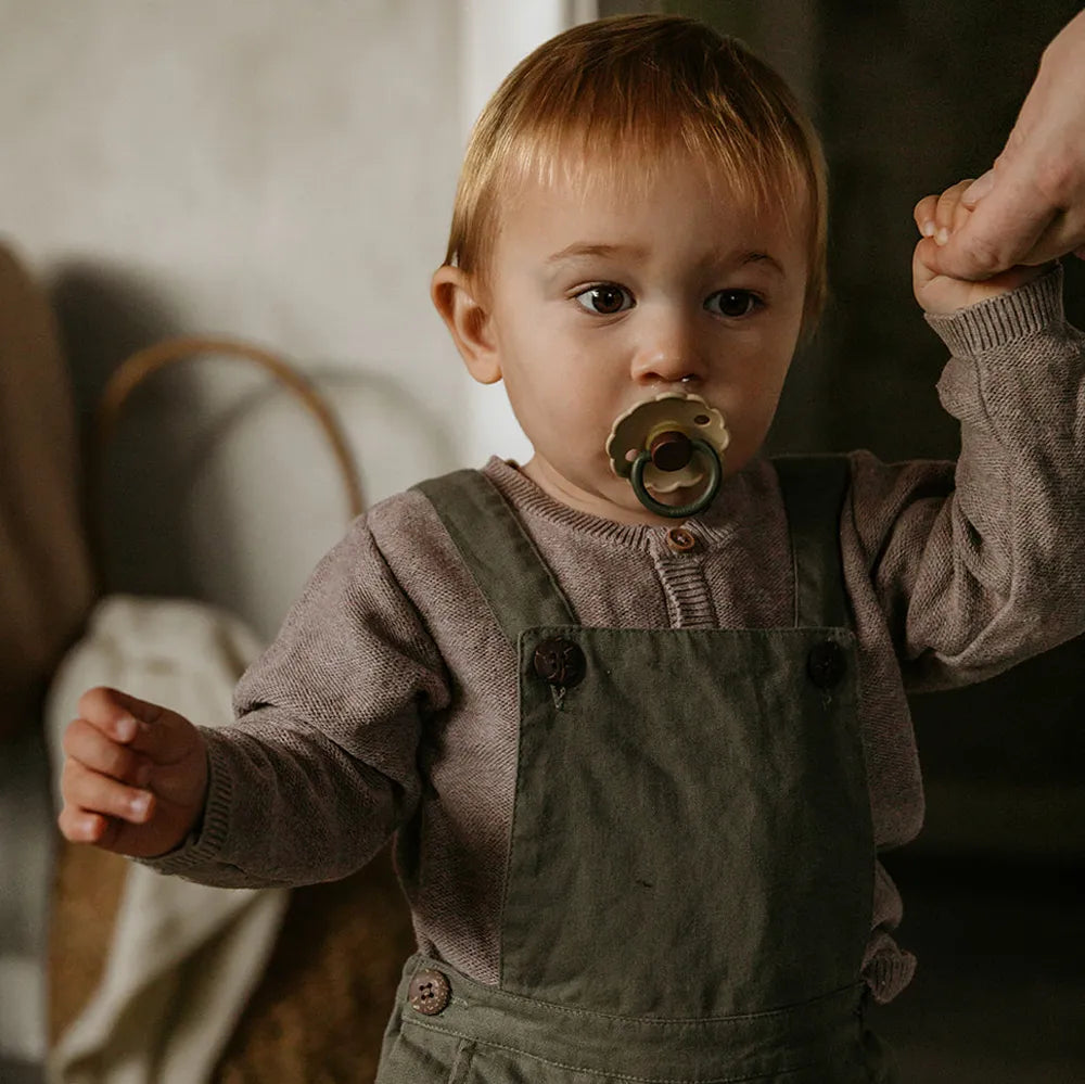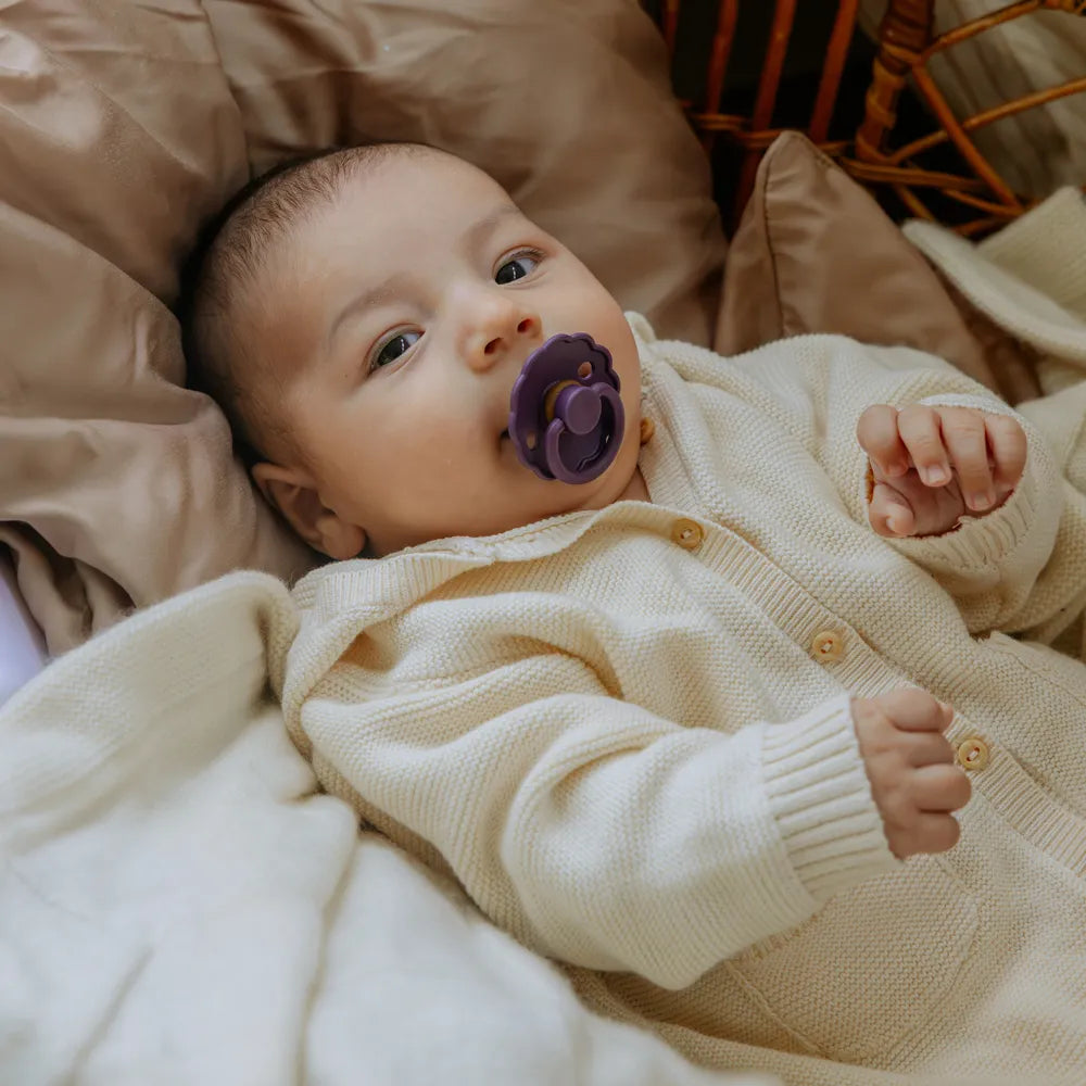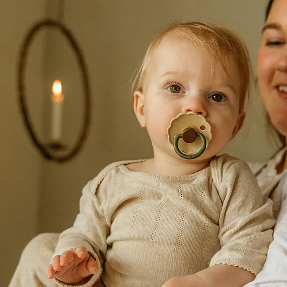 Design and aesthetics: The Daisy model is characterized by its flower-shaped shield, where the rounded petals create a calm and recognizable expression. The design is inspired by the shapes of nature and gives the pacifier a light and harmonious touch that stands out from more minimalist pacifier models, while still fitting naturally into modern Scandinavian baby equipment.