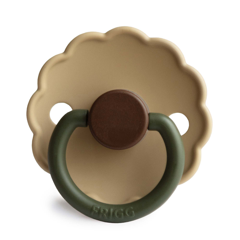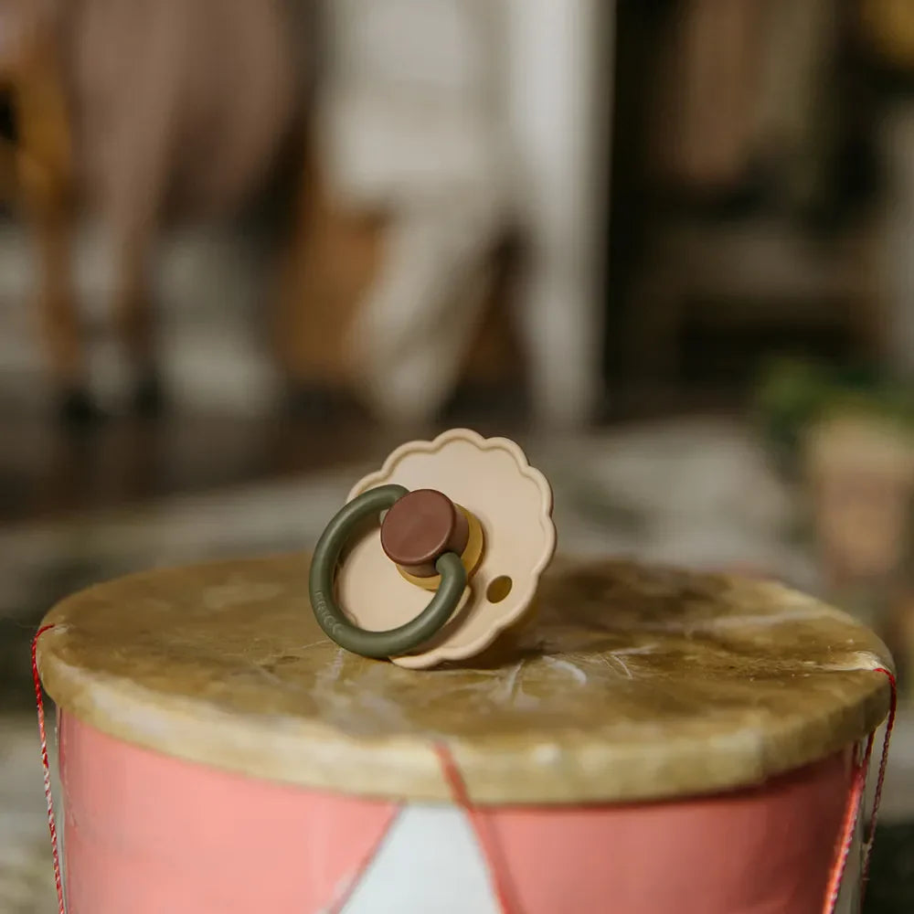 FRIGG Daisy in the color Acorn combines a flower-inspired shield with a light and harmonious expression. The design is inspired by the soft petals of the marguerite, where the rounded shapes give the pacifier a calm and recognizable touch. The characteristic shield creates a soft visual expression, which distinguishes the model from more classic pacifier shapes.