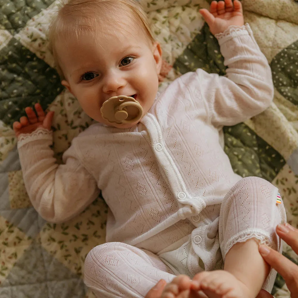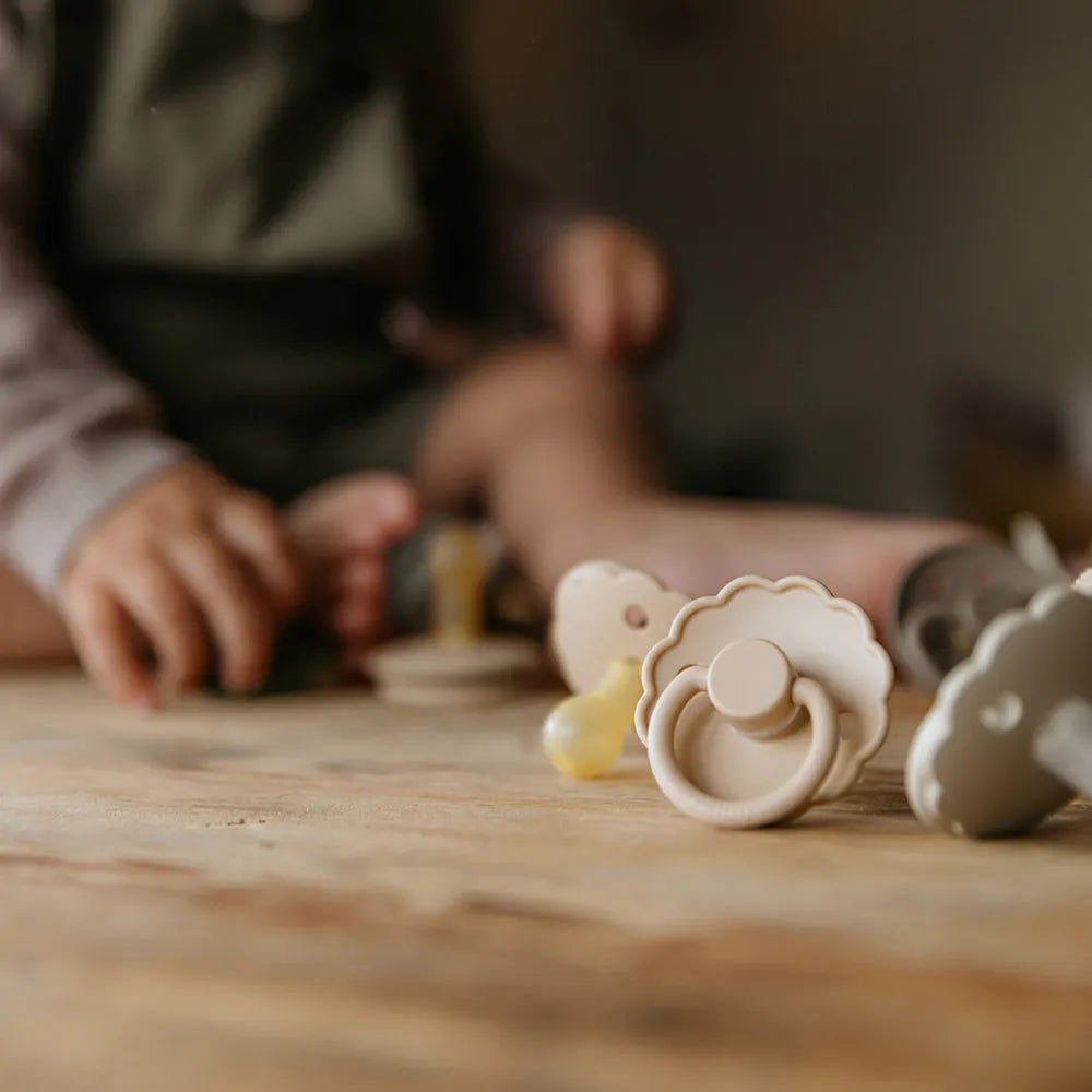 Design and aesthetics: The Daisy model is characterized by its flower-shaped shield, where the rounded petals create a calm and recognizable expression. The design is inspired by the shapes of nature and gives the pacifier a light and harmonious touch that stands out from more minimalist pacifier models, while still fitting naturally into modern Scandinavian baby equipment.