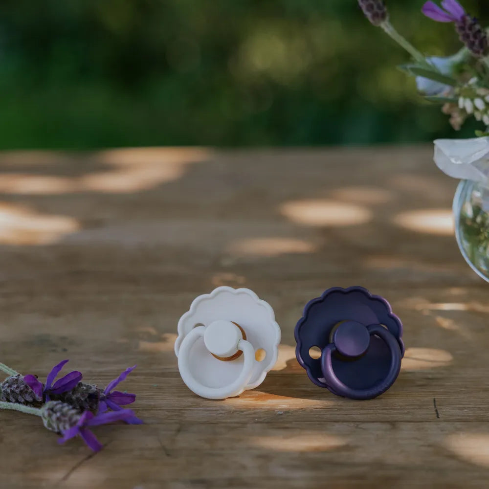 Design and aesthetics: The Daisy model is characterized by its flower-shaped shield, where the rounded petals create a calm and recognizable expression. The design is inspired by the shapes of nature and gives the pacifier a light and harmonious touch that stands out from more minimalist pacifier models, while still fitting naturally into modern Scandinavian baby equipment.