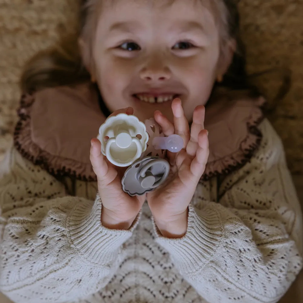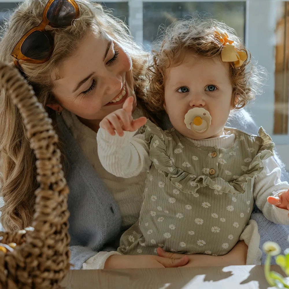 Design and aesthetics: The Daisy model is characterized by its flower-shaped shield, where the rounded petals create a calm and recognizable expression. The design is inspired by the shapes of nature and gives the pacifier a light and harmonious touch that stands out from more minimalist pacifier models, while still fitting naturally into modern Scandinavian baby equipment.