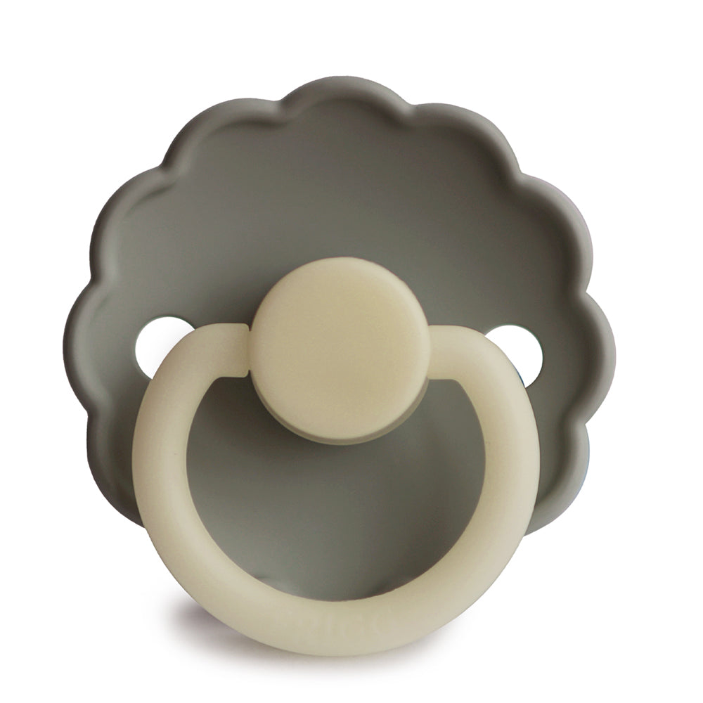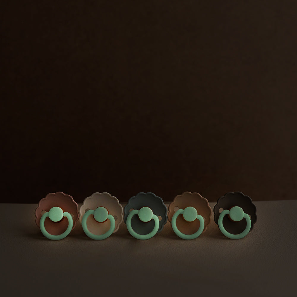 FRIGG Daisy Night in the color Portobello combines a flower-inspired shield with a calm and harmonious expression. The design is inspired by the soft petals of the marguerite, where symmetry and rounded shapes create a recognizable visual impression. The night model also has a discreet luminous effect, which makes it easier to find the pacifier in the dark.