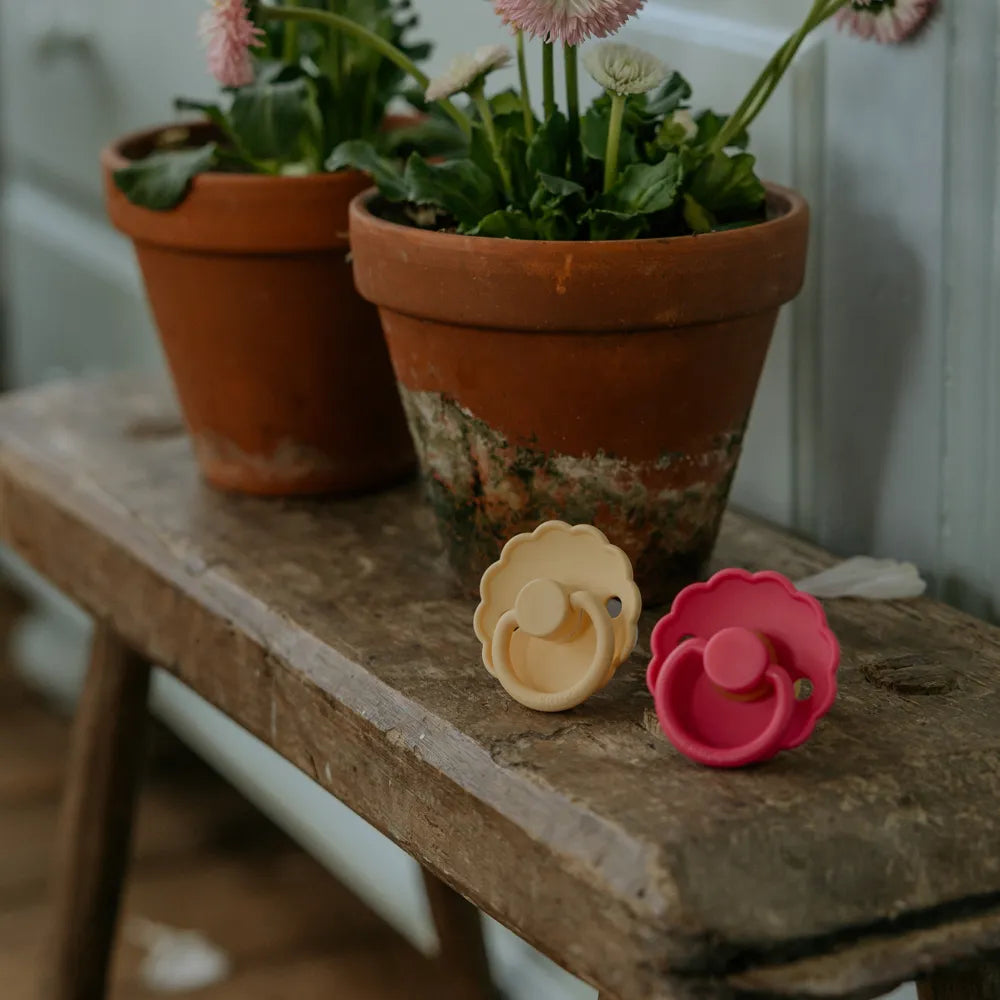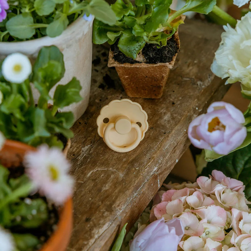 Design and aesthetics: The Daisy model is characterized by its flower-shaped shield, where the rounded petals create a calm and recognizable expression. The design is inspired by the shapes of nature and gives the pacifier a light and harmonious touch that stands out from more minimalist pacifier models, while still fitting naturally into modern Scandinavian baby equipment.