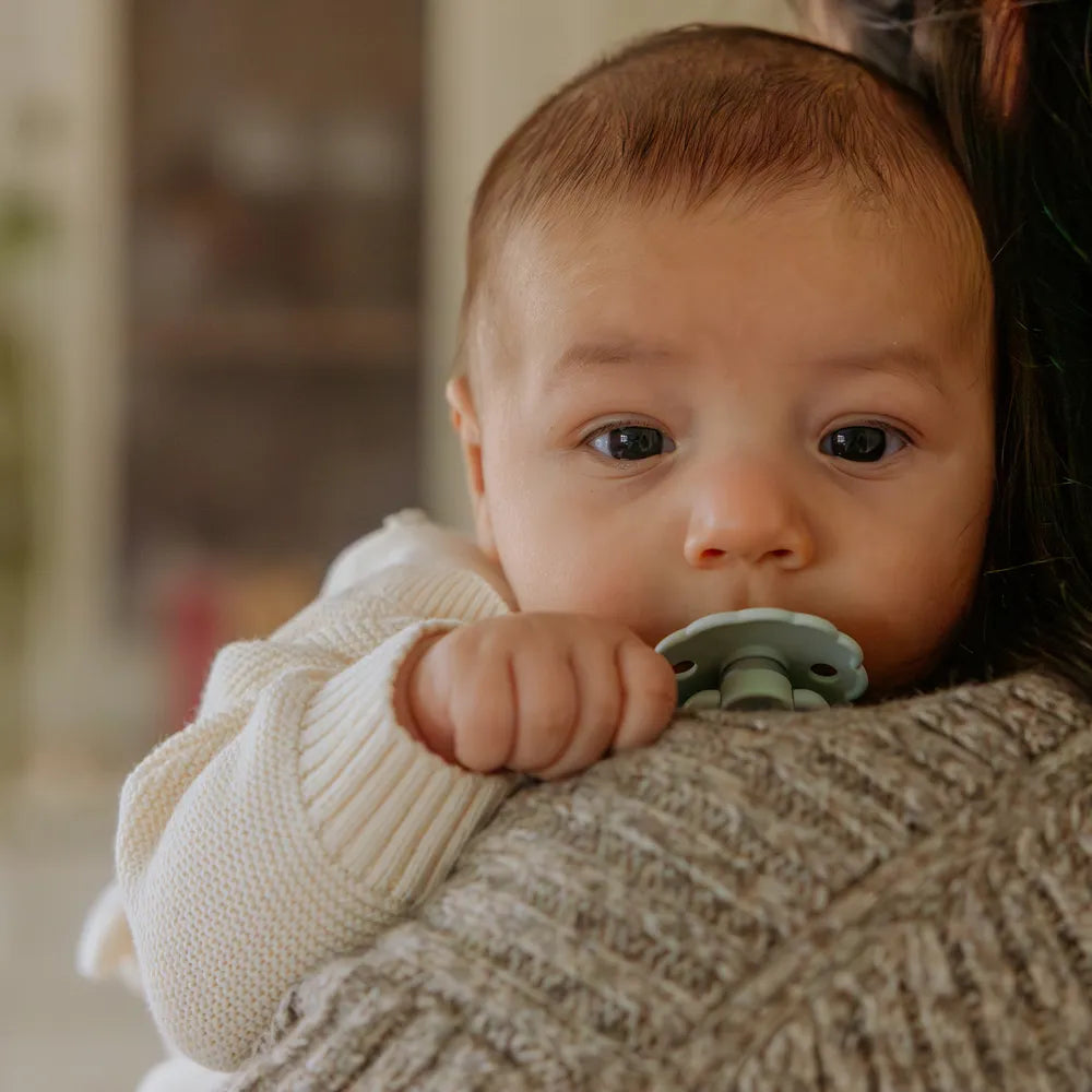 Design and aesthetics: The Daisy model is characterized by its flower-shaped shield, where the rounded petals create a calm and recognizable expression. The design is inspired by the shapes of nature and gives the pacifier a light and harmonious touch that stands out from more minimalist pacifier models, while still fitting naturally into modern Scandinavian baby equipment.