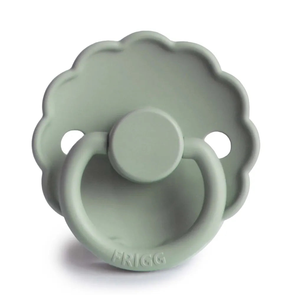 FRIGG Daisy in the color Sage combines a flower-inspired shield with a light and harmonious expression. The design is inspired by the soft petals of the marguerite, where the rounded shapes give the pacifier a calm and recognizable touch. The characteristic shield creates a soft visual expression, which distinguishes the model from more classic pacifier shapes.