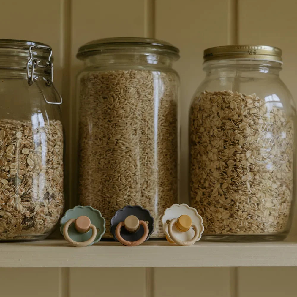 Design and aesthetics: The Daisy model is characterized by its flower-shaped shield, where the rounded petals create a calm and recognizable expression. The design is inspired by the shapes of nature and gives the pacifier a light and harmonious touch that stands out from more minimalist pacifier models, while still fitting naturally into modern Scandinavian baby equipment.