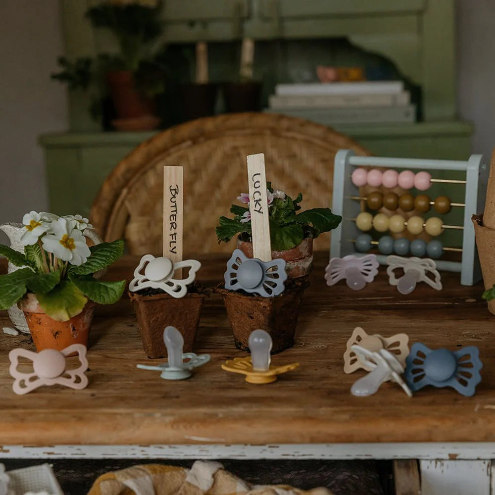 FRIGG Lucky is inspired by the four-leaf clover – a symbol of luck and security. The symmetrical shape of the shield has been developed with a focus on both balance and function, so that the pacifier lies correctly in the mouth regardless of position. The round teat part is created based on the classic shape, which is reminiscent of the mother's breast, while the design retains the calm, Scandinavian expression that characterizes FRIGG.
