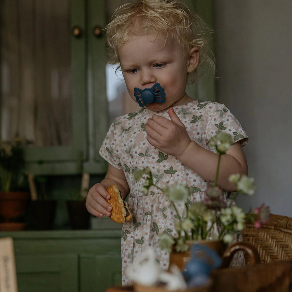 FRIGG Lucky is inspired by the four-leaf clover – a symbol of luck and security. The symmetrical shape of the shield has been developed with a focus on both balance and function, so that the pacifier lies correctly in the mouth regardless of position. The round teat part is created based on the classic shape, which is reminiscent of the mother's breast, while the design retains the calm, Scandinavian expression that characterizes FRIGG.