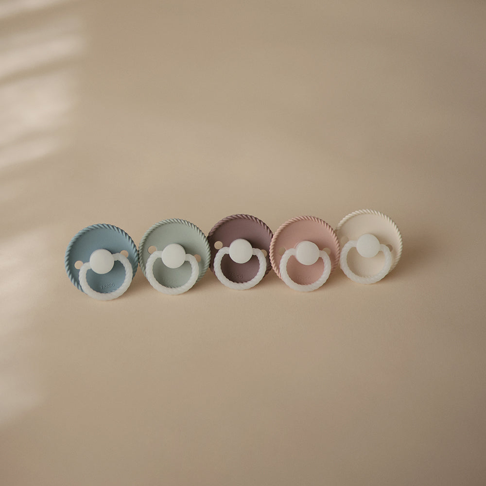 FRIGG pacifiers are created with great care for both child and parent. The shield is made of virgin PP plastic – a clean and strong type of plastic that has never been recycled. This means that we avoid unwanted substances and ensure a uniform, durable and skin-friendly material. Production takes place in Denmark by experienced specialists, where the entire process takes place in-house for maximum control and quality.