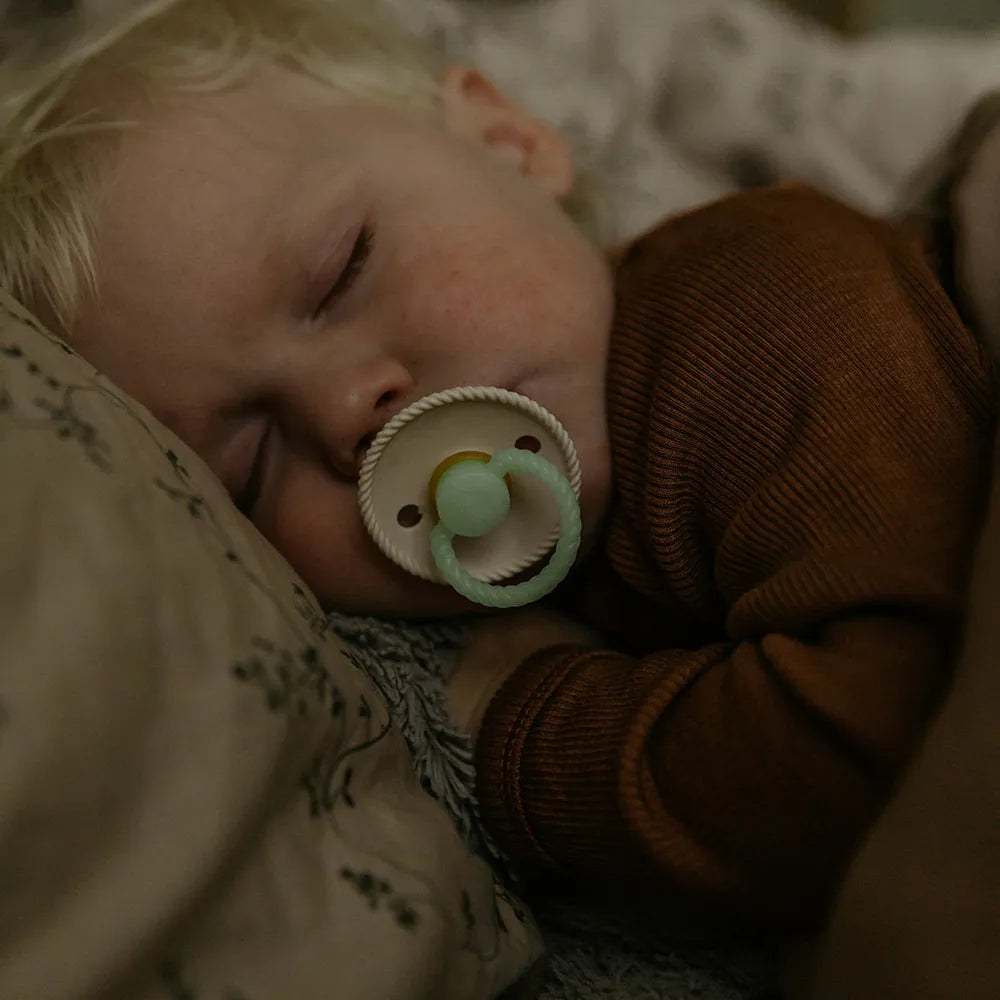 The Night model has a discreet luminous effect, which makes it easier to find the pacifier in the dark without turning on the light. Rope-the design is inspired by the structure of the rope and gives the shield a discreet, textured character.