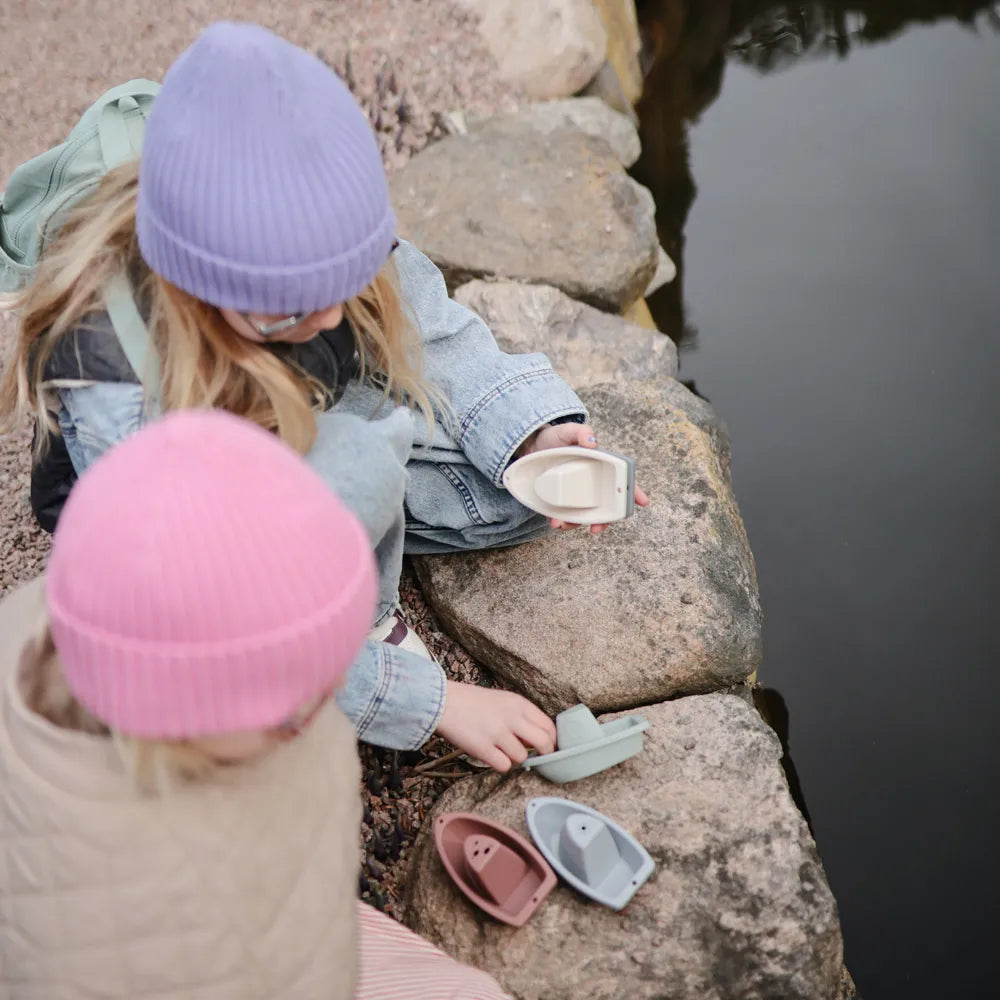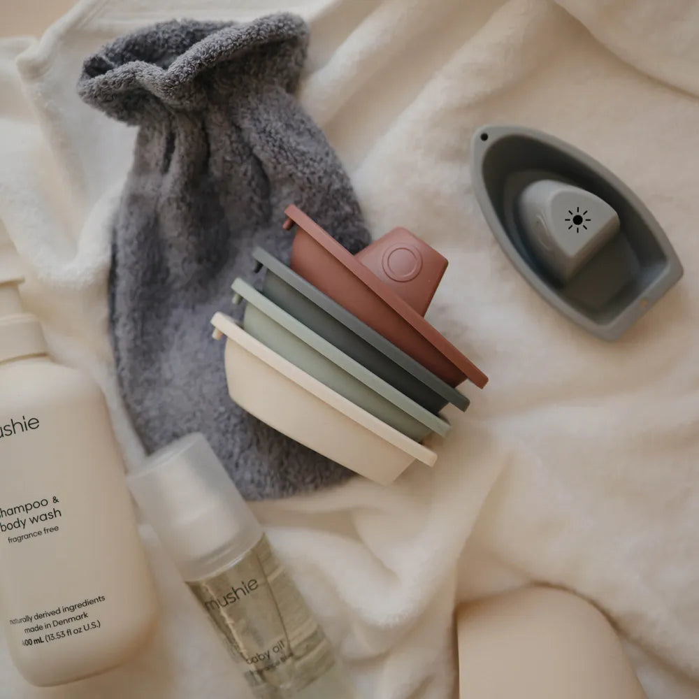 Mushie bathing boats are a simple and inviting set of bath toys that make bath time a calm, playful time for both children and adults. The small boats are designed for small hands and are perfect for the first games in water, where the child can scoop, float, push and let the imagination sail away. Regardless of whether you use them in the bathtub, under the shower or in a tub on the terrace, the boats provide a recognizable and safe framework for play, where the child can explore the movements of the water at their own pace. The set consists of five boats in mushie's well-known, subdued colours, which fit naturally into a Scandinavian home. The boats are designed in hard plastic that feels solid in use and can withstand being stacked, filled with water and taken from room to room. The stackable function makes it easy to vary the play: the child can practice fine motor skills by stacking the boats, sorting them and building small "rafts", while at the same time you get a practical storage solution that does not take up much space in the bathroom. Mushie bath boats also work well as bath toys outside the bath when the play continues on the floor or in the sandbox.