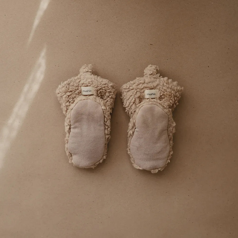 Mushie cotton boots are a soft and simple solution when little feet need to be kept warm without being wrapped up too heavily. These baby boots are designed for the smallest and are well suited for both pram rides, naps in the pram and cozy moments indoors, where the child needs extra warmth around the toes. The expression is simple and Scandinavian, so the boots are easy to combine with the rest of the wardrobe, regardless of whether you are going for a neutral basic look or a more complete set. The boots are made of organic sherpa cotton, which feels soft against the skin and provides a comfortable, insulating surface. Inside, they are lined with soft jersey cotton, which contributes to a nice feel and helps retain heat. The secure closure is designed to fit snugly on the foot, so the boots stay where they should, even when the child moves.