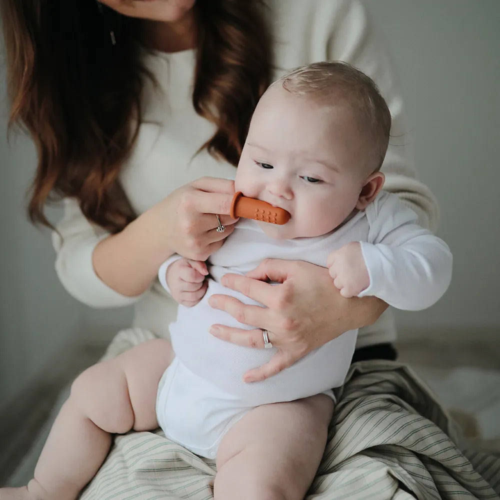 Mushie finger toothbrush in 2-pack is a simple and safe tool to introduce good oral hygiene from the very first months. A finger toothbrush makes it easy to get close to the child's small teeth and gums, because you control the movements with your own finger. It provides a calm start, where the child can get used to the routine at a pace that feels natural - both with the first teeth and during periods when the gums are extra sensitive. The toothbrushes are made of 100% food-grade silicone, which feels soft against the mouth and is comfortable to use without hard edges. It fits like a little thimble and is easy to take off and on, so you can quickly change hands or adjust the grip along the way. On one side you will find short, soft silicone brushes that can be used for gentle cleaning of teeth and gums. On the other hand, there are small knobs that can gently massage the gums - a good help when the child needs extra comfort in connection with teething. A 2-pack is practical in everyday life: You can have one at home and one in the nappy bag, or use one as a spare when the other is for cleaning and drying. The finger toothbrush can be used as part of the brushing routine or after meals, when you want to keep your mouth fresh in a gentle way.
