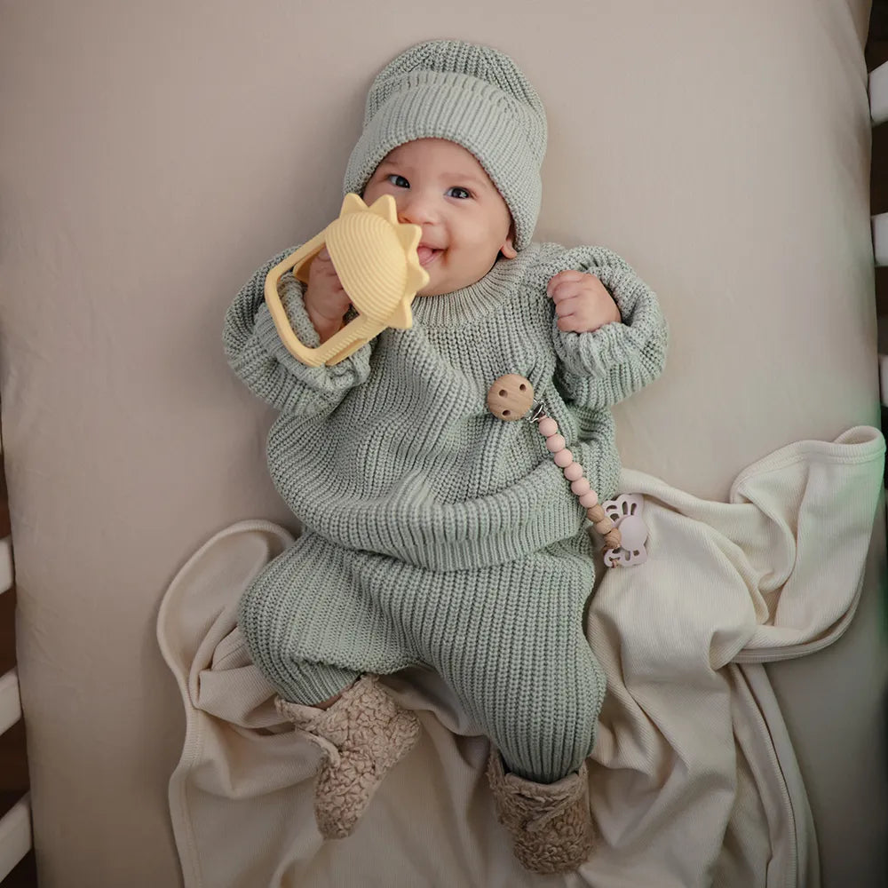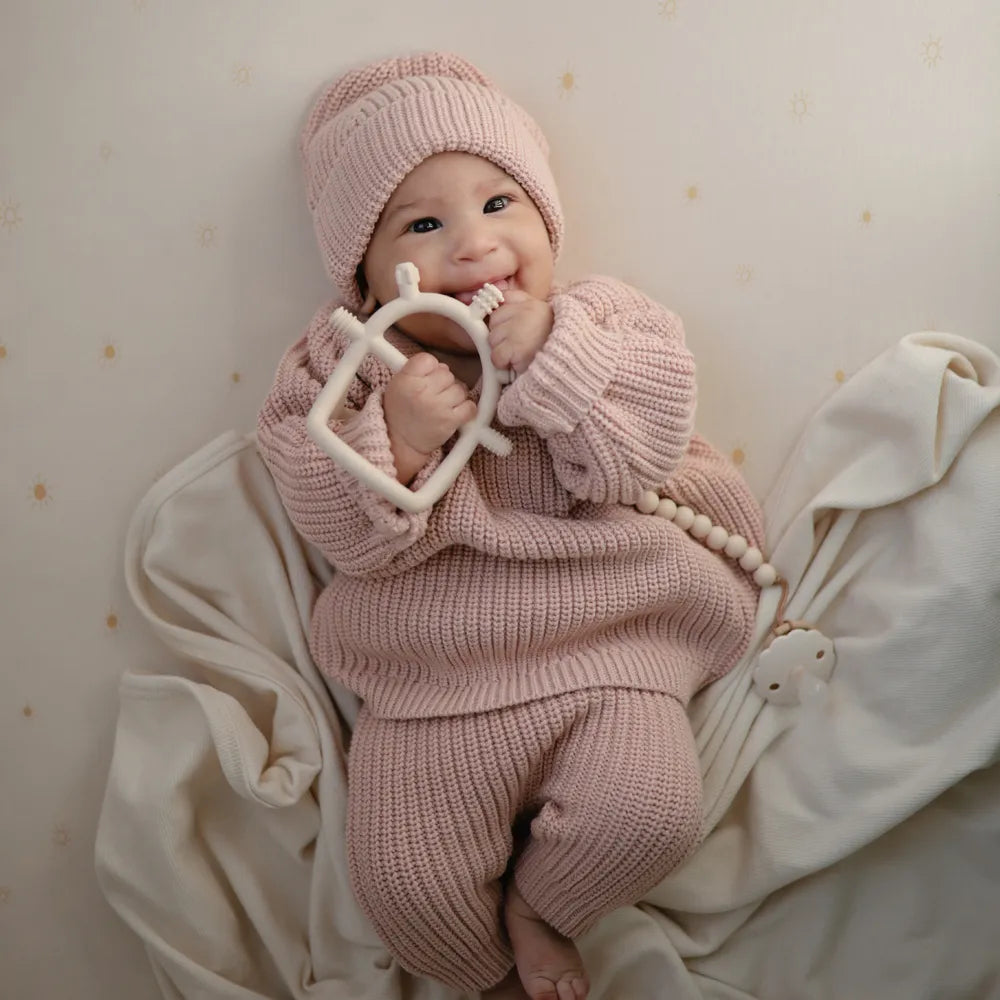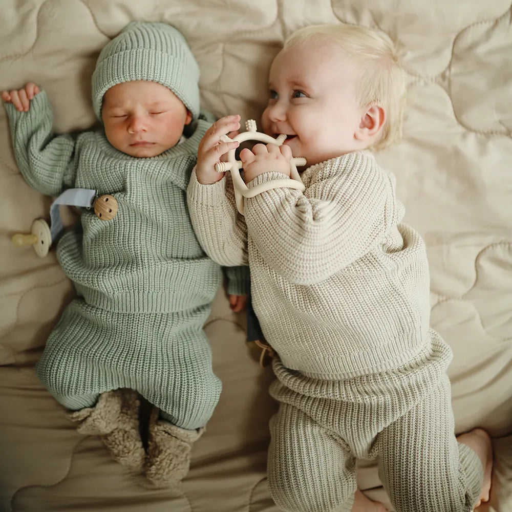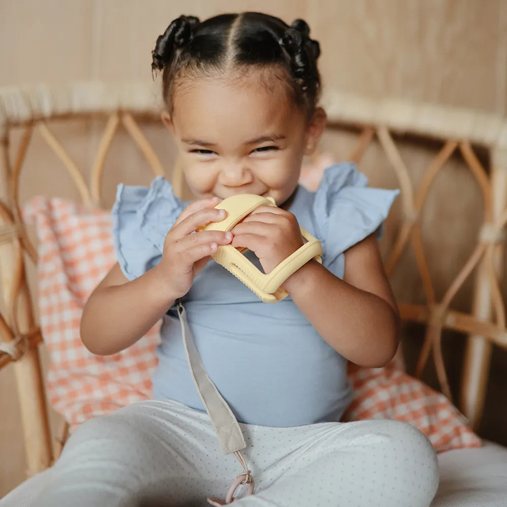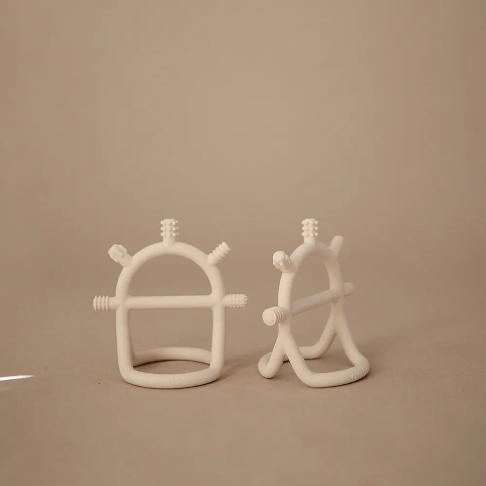 Mushie no drop teether has been developed for babies, created for the periods when sore gums and new teeth take up a lot of everyday life. The smart design makes it easier for the child to hold on, even when the grip is still developing. The inner opening acts as a small handle, which small hands can naturally grasp, and the teether can sit more stably at the same time, so that it does not so easily fall to the floor again and again. It gives peace of mind in the situation - both at the changing table, in the pram and when the child is lying on the play rug and exploring the world with their mouth.