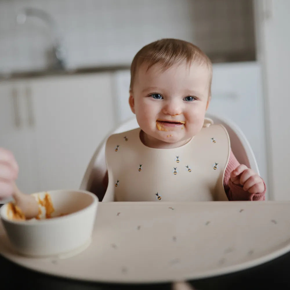 The material is silicone, which is flexible and easy to handle in a busy everyday life. The bib is easily shaped around the child's neck and sits stably so that it can follow the child's movements when looking around, laughing or reaching for the spoon. The deep front pocket is one of the details that you quickly become happy with: It helps to collect crumbs and spillage, so that less ends up on the floor, in your lap or in the chair.