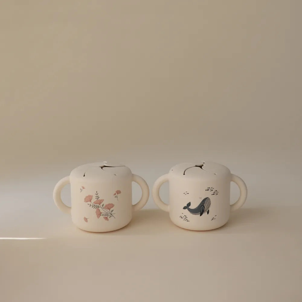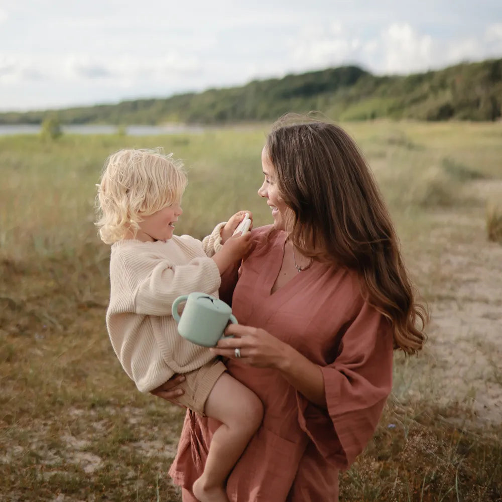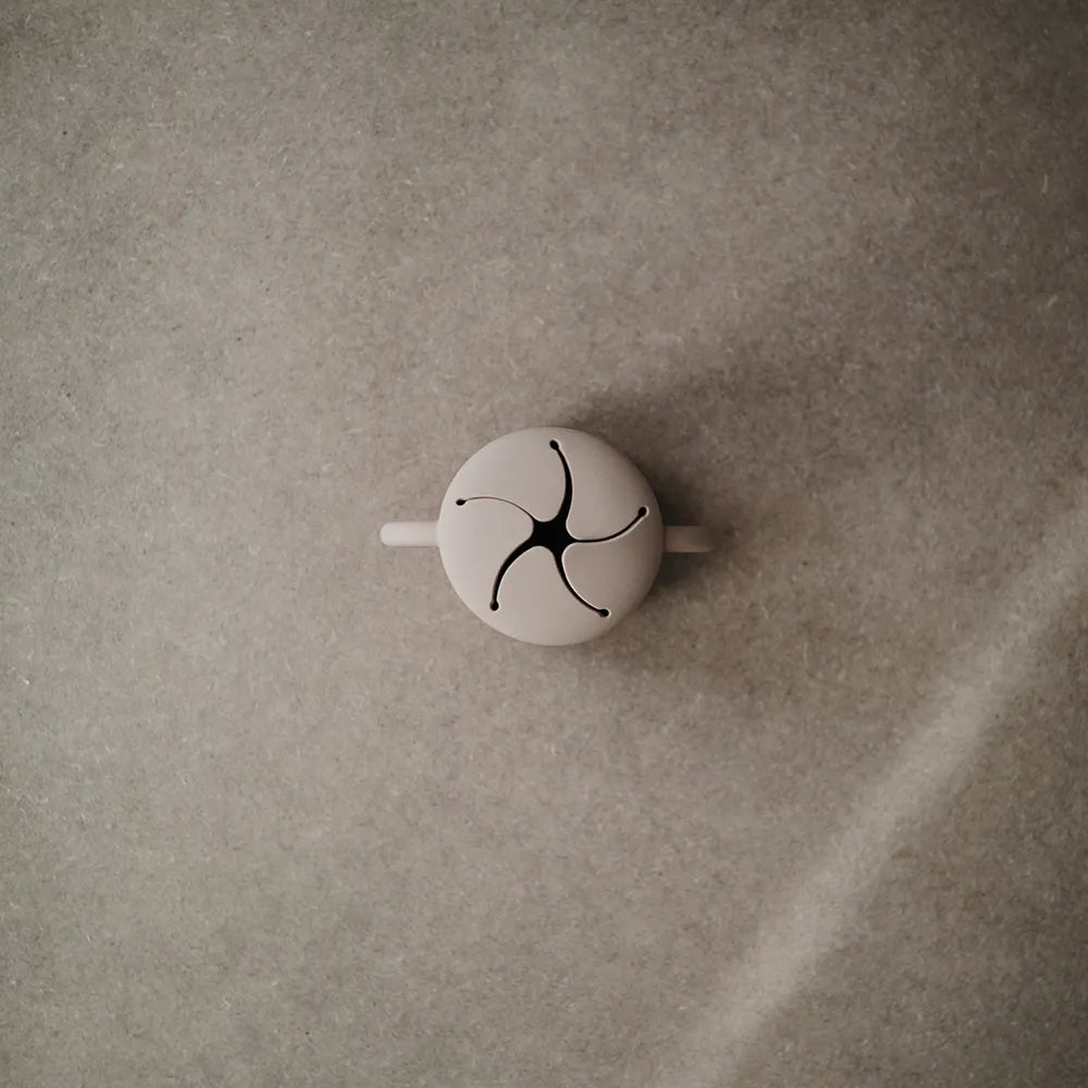 The Mushie silicone snack cup is a practical helper in everyday life when small children want to eat themselves, but you would prefer to avoid snacks ending up on the floor, in the car seat or between the sofa cushions. This Mushie cup is designed to make it easy for the child to take small bites at their own pace, regardless of whether you are at home, on a trip or on the go. It goes well with everything from pieces of fruit and small biscuits to other dry snacks, and it is especially good during those periods when curious hands want to investigate everything - including gravity. The cup is made of soft silicone, which feels comfortable to hold for small hands. The two handles provide a stable grip, so that the child can more easily lift and carry the cup himself. At the top is a flexible opening with soft "flaps", which make it possible to reach down to the snacks, but which also help to keep the contents inside if the cup falls over or is turned upside down.