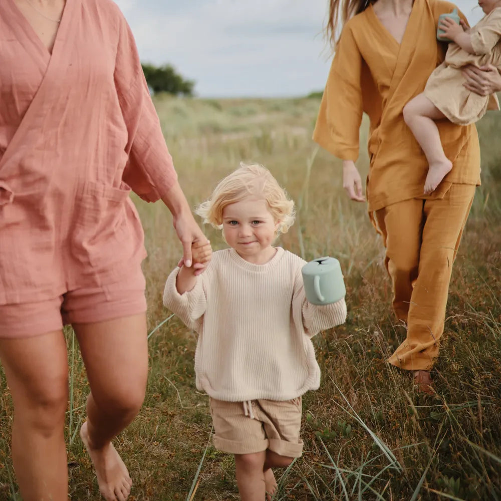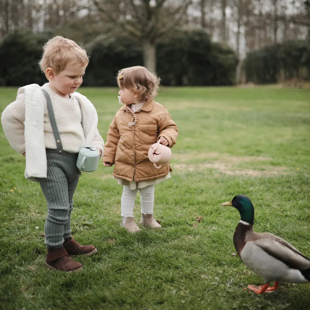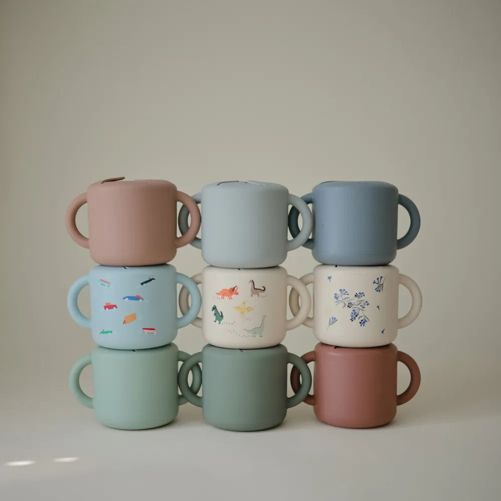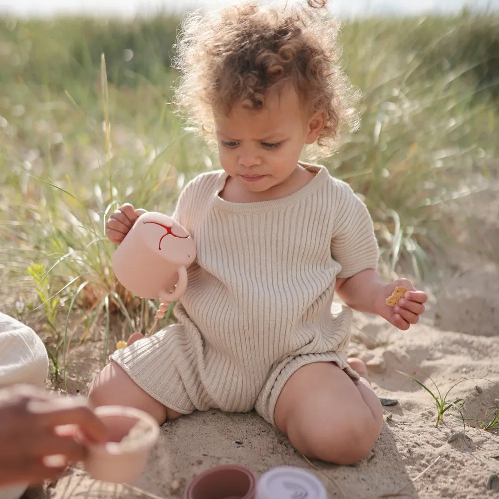 The Mushie silicone snack cup is a practical helper in everyday life when small children want to eat themselves, but you would prefer to avoid snacks ending up on the floor, in the car seat or between the sofa cushions. This Mushie cup is designed to make it easy for the child to take small bites at their own pace, regardless of whether you are at home, on a trip or on the go. It goes well with everything from pieces of fruit and small biscuits to other dry snacks, and it is especially good during those periods when curious hands want to investigate everything - including gravity. The cup is made of soft silicone, which feels comfortable to hold for small hands. The two handles provide a stable grip, so that the child can more easily lift and carry the cup himself. At the top is a flexible opening with soft "flaps", which make it possible to reach down to the snacks, but which also help to keep the contents inside if the cup falls over or is turned upside down.