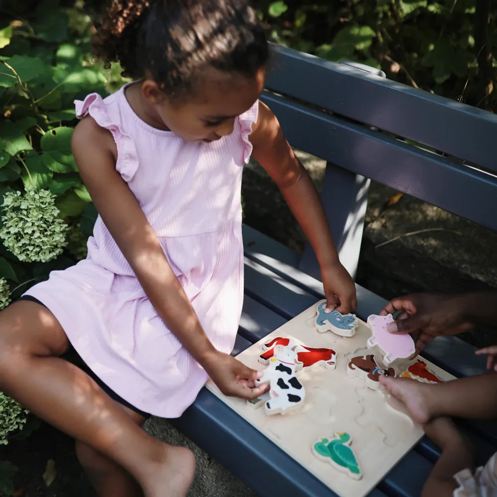The wooden puzzle is made from FSC-certified wood, which means that the material comes from responsibly managed forests. The solid pieces are created for repeated play and can withstand the child picking them up, turning them over and putting them back in place many times during the day. The dinosaur theme also gives the opportunity to talk about the figures and their shapes, which makes the puzzle more than just an activity – it also becomes a small conversation about animals, colors and shapes. The combination of learning, sensuality and durable materials makes the puzzle a calm and developing game that can be used again and again in the child's everyday life.